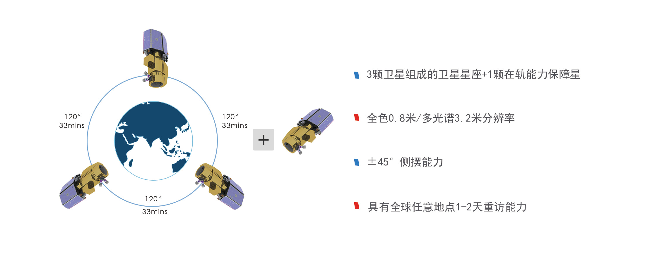 2015年7月“北京二号”遥感卫星星座成功发射。该星座系统包括3颗0.8米全色、3.2米多光谱分辨率的光学遥感卫星以及自主研建的地面系统,具有高空间分辨率、高时间分辨率和高辐射分辨率特点, 技术能力达到国际先进水平,能够实现全球任意地点一到两天观测任务重访,可面向全球提供高空间和高时间分辨率的卫星遥感大数据产品和空间信息综合应用服务,可为政府科学治理、资源与环境监测、国家安全和 “数字中国”建设等国计民生领域以及国家重大需求提供空间信息综合应用服务和解决方案。