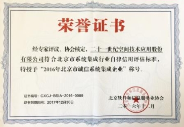 2016年12月29日,经专家评议、北京软件和信息服务业协会核定,我公司符合北京市系统集成行业自律信用评估标准,被授予“2016年北京市诚信系统集成企业”称号。